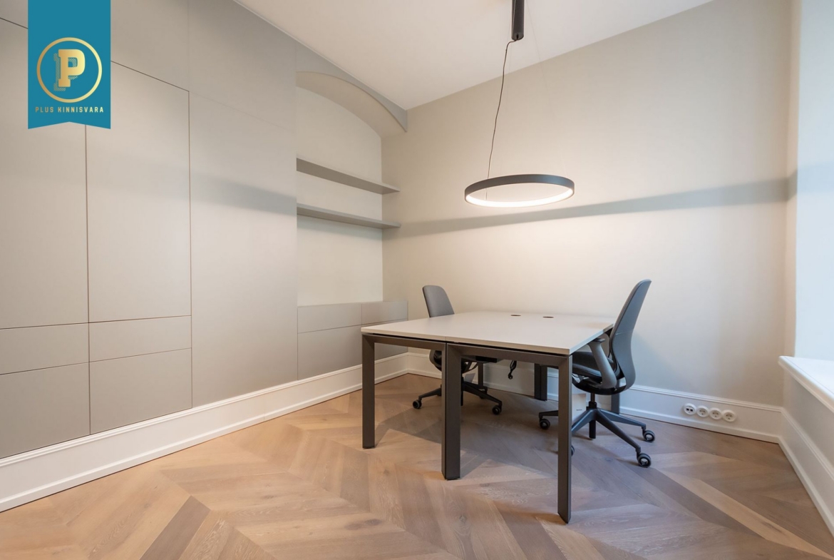 Kontoriruum on kahe töökoha jaoks kujundatud ja sisustatud. Tervet seina hõlmav dokumendikapp on samuti kena sisustuselement ja kindlasti vajalik dokumentide vm hoiustamiseks.