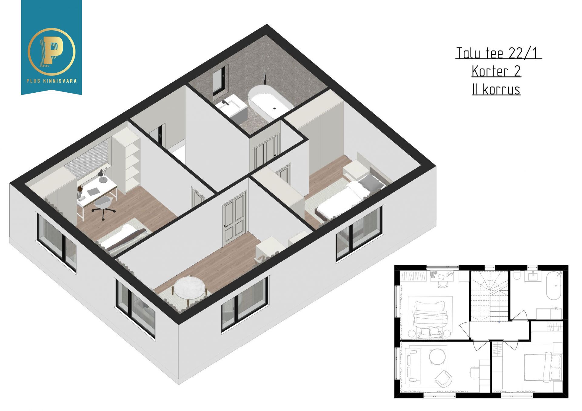 Talu tee 22/1 on 4-toaline paarismajaboks on 2-kordne ning selle koosseisu kuuluvad avatud köögiga elutuba, kolm magamistuba, saunaga 2 vannituba-tualetti, tehnoruum, trepihall, garderoob ja tuulekoda.