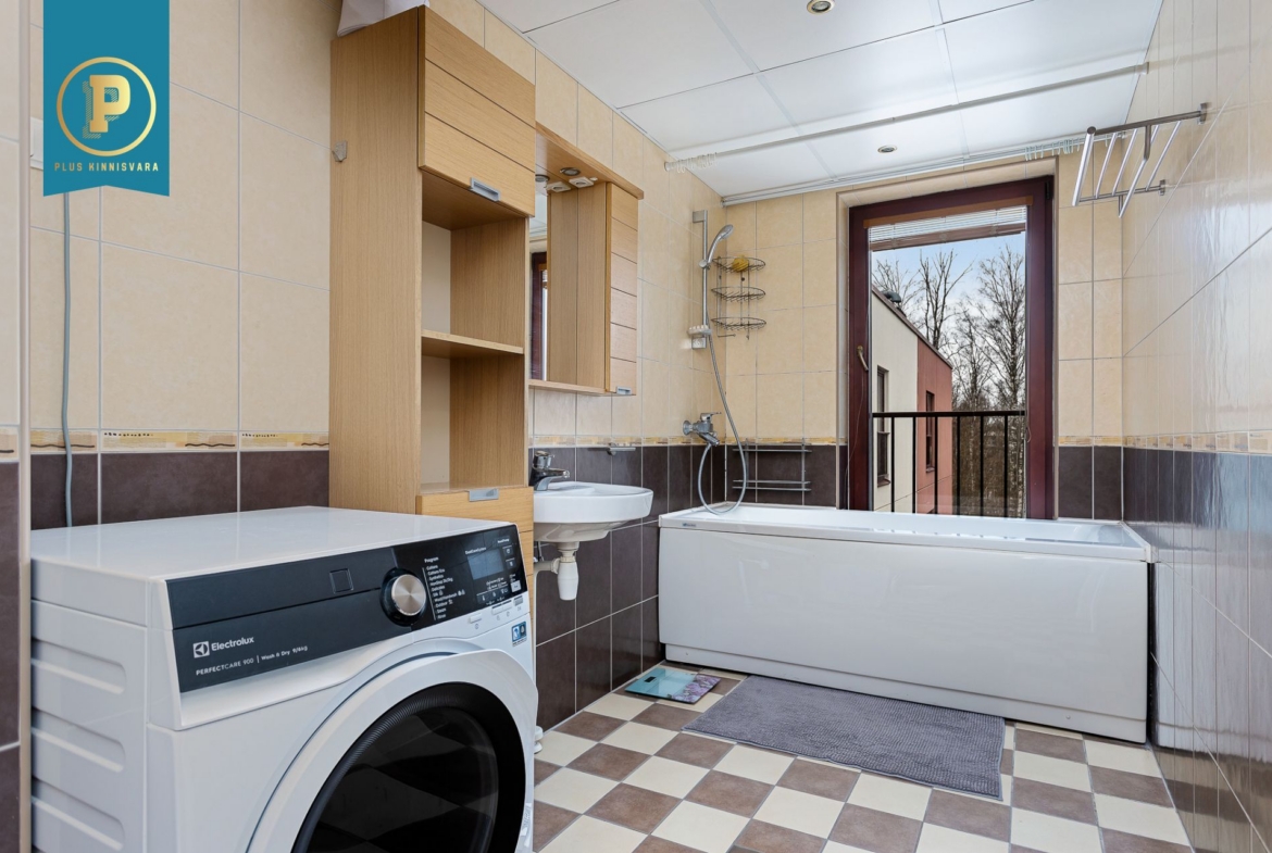 Suur elutuba koos avatud köögiga on avar ning mõnusalt valgusküllane ruum, kus tänu läbimõeldud lahendusele on piisavalt ruumi nii köögis toimetamiseks, pere söögilauale, kui ka vaba aja veetmiseks elutoa poolel. Kvaliteetne köögimööbel sisaldab integreeritud tehnikat (keraamiline pliit, elektriline ahi, õhupuhasti, külmik sügavkülmaga ja nõudepesumasin).