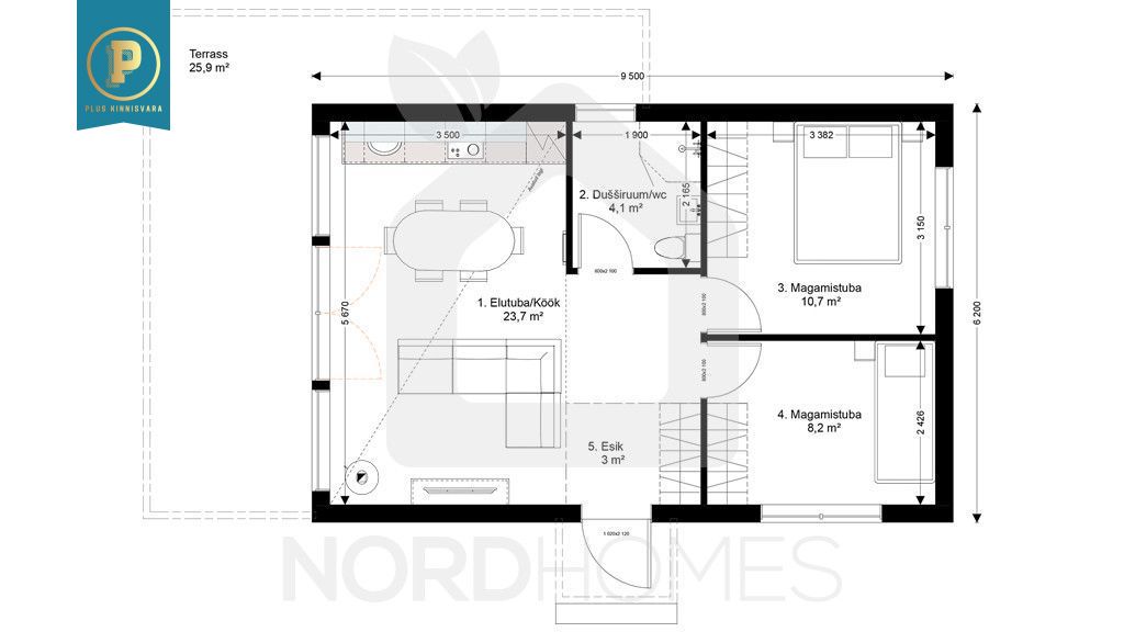 Elementmaja on netopinnaga 50 m2, millele lisandub ca 20 m2 poolkorrus magamistubade