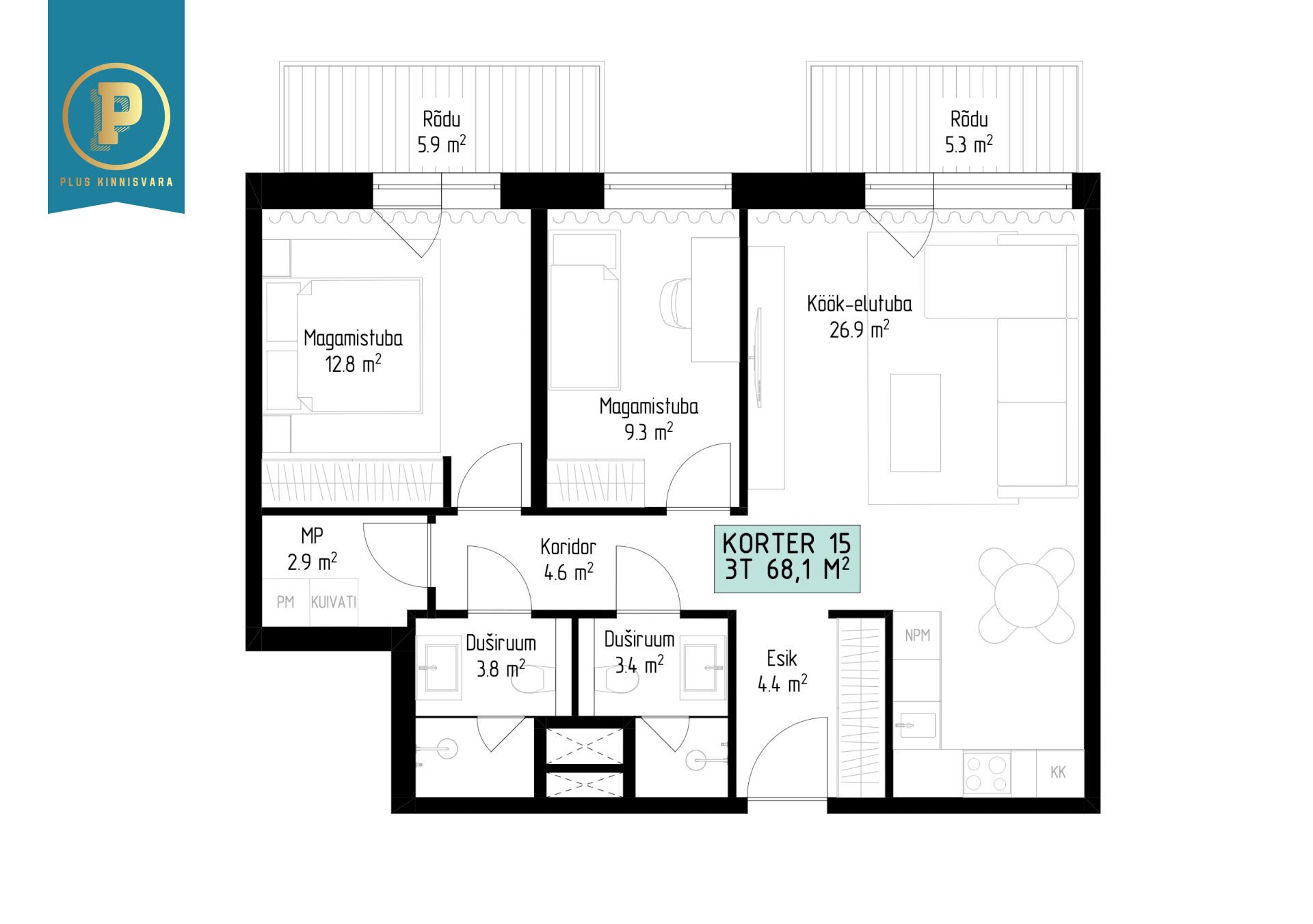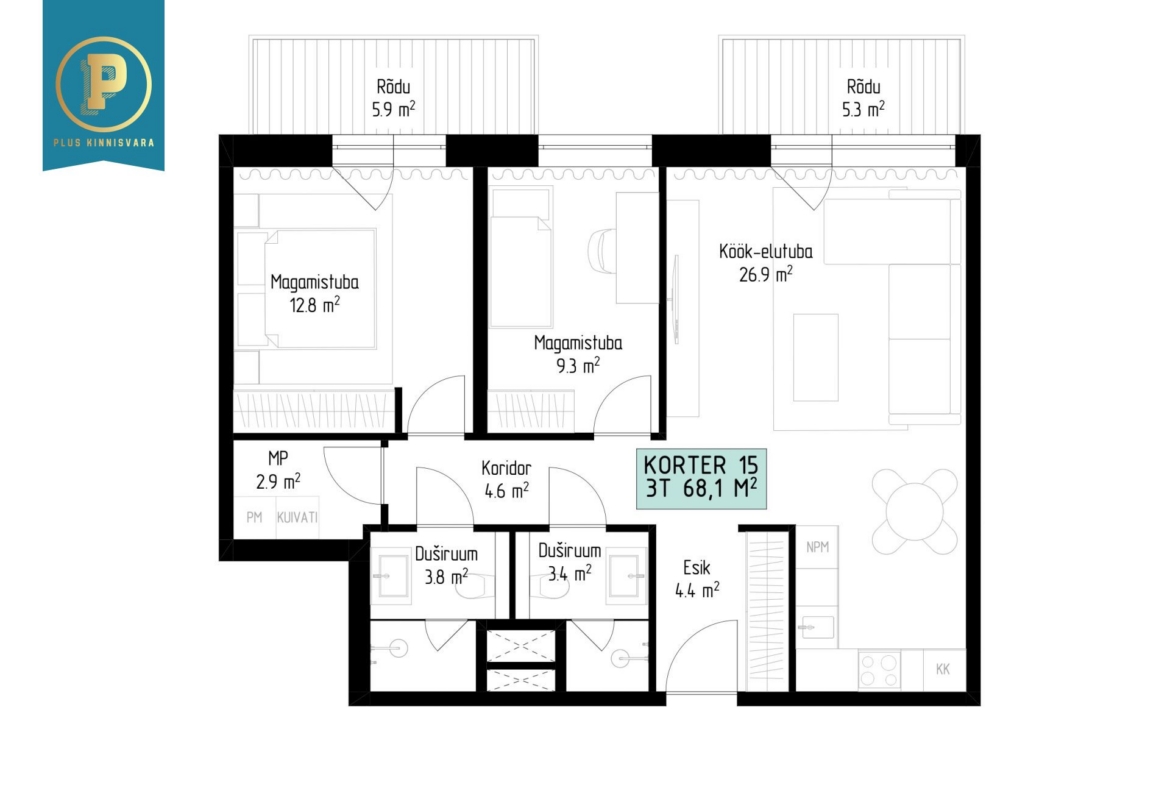Korter nr 15 on väga mugava ja erilise planeeringuga 3-toaline kodu, kus on esik, avatud köögiga elutuba, kaks magamistuba, kaks vannituba-tualetti, kaks rõdu ning lisaks veel majapidamisruum. Elutoast ja magamistoast pääseb vastavalt 5,3 m2 ja 5,9 m2 suurusele rõdule – täiuslik koht hommikukohviks või õhtuseks lõõgastumiseks.