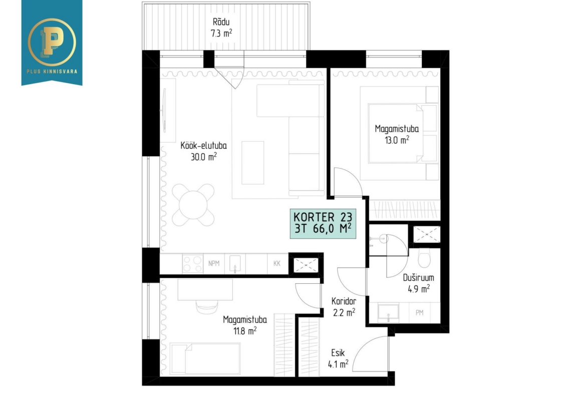 Korter nr 23 on avara ja läbimõeldud planeeringuga 3-toaline kodu, kus on esik, kaks magamistuba, duširuum/WC ning avatud köögiga elutuba. Elutoast pääseb 7,3 m2 suurusele rõdule – täiuslik koht hommikukohviks või õhtuseks lõõgastumiseks.