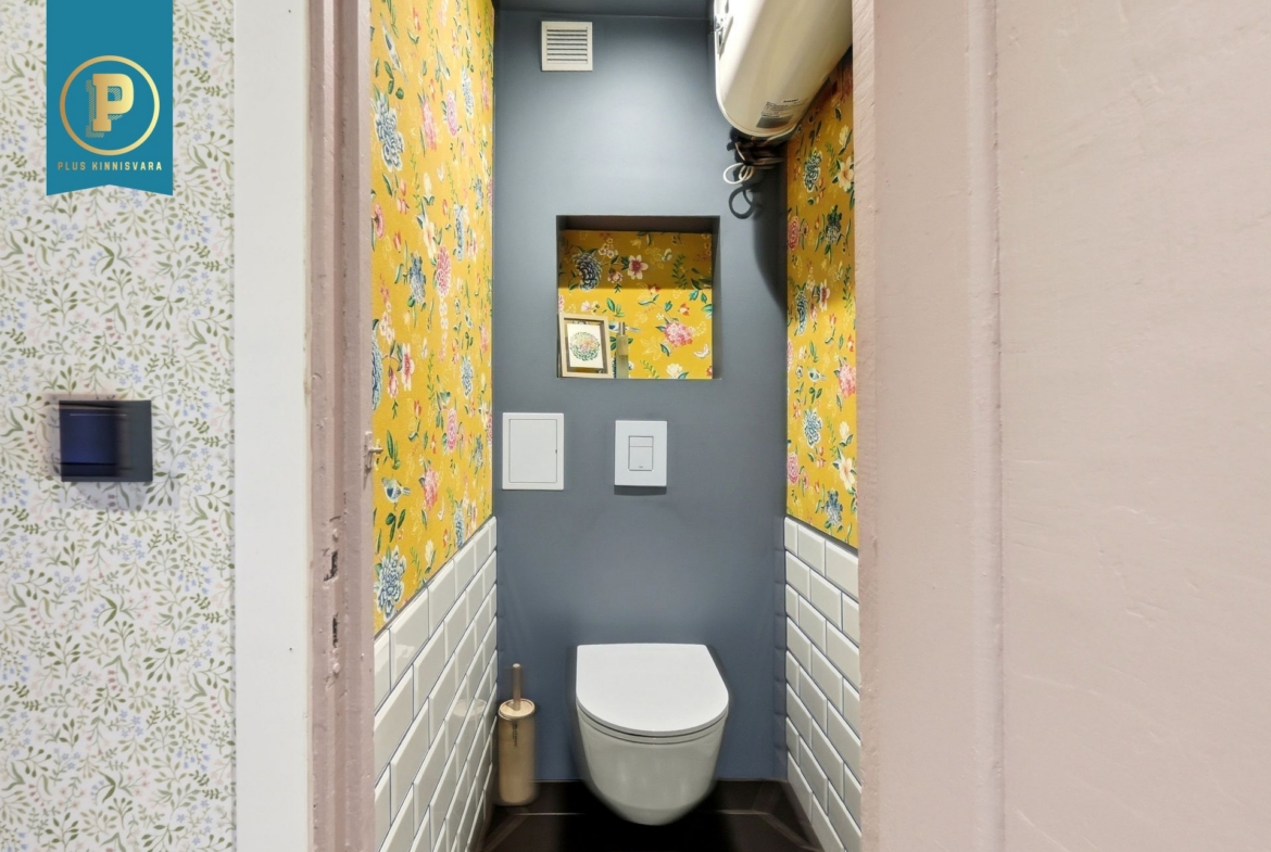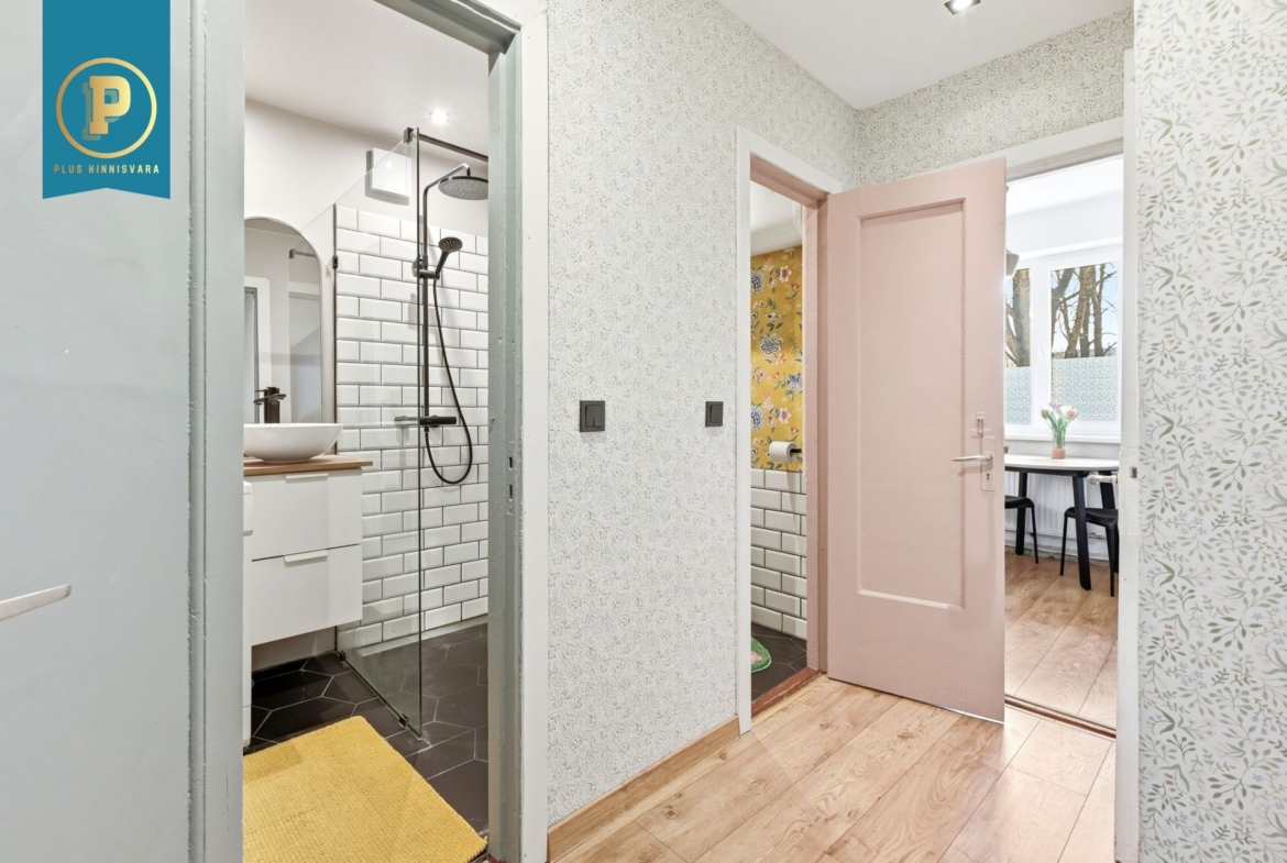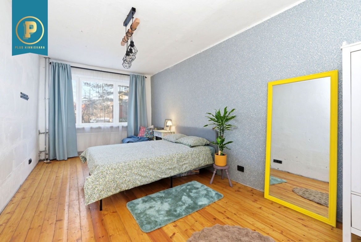 Pakutava kodu on läbi maja planeeringuga ja selle koosseisu kuuluvad esik, avar elutuba, suur magamistuba, köök, vannituba ja eraldi tualett. Lisaks on korteris mitmeid sisseehitatud kappe nii köögis kui esikus. Renoveerimise käigus on muuhulgas vahetatud elektrijuhtmestik ja torustik. Põrandaid katab kvaliteetne laminaatparkett, magamistoas on taastatud originaallaudis, mis on tegelikult ka teistes tubades parketi all säilinud, kuid vajab taastamist. Renoveerimise käigus on säilitatud ka muid originaaldetaile nagu uksed ja sisseehitatud kapid. Seinad on värvitud ja tapetseeritud ning elutoas on kasutatud ka lubikrohvi, mis on väga naturaalne ja hingav materjal. Sanruumide põrandad ja osaliselt ka seinad on plaaditud. Mõlemad toad on piisavalt suured, et mahutavad vajadusel ka kodukontori nurga.