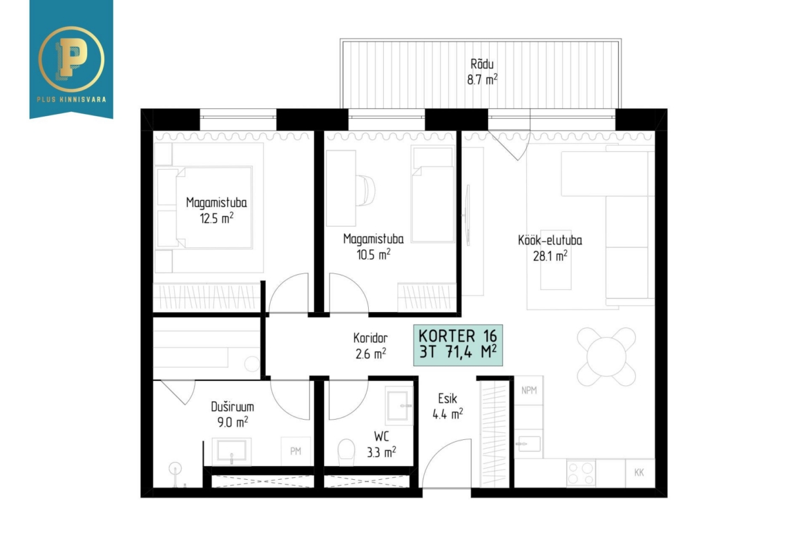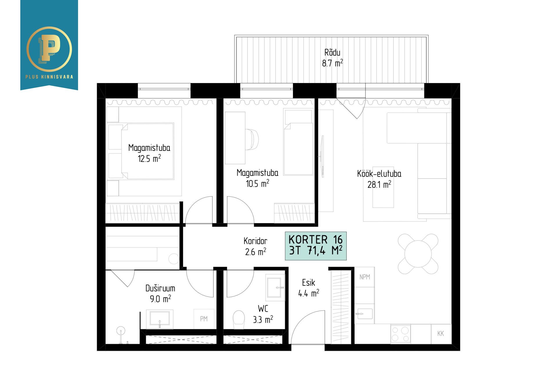 Korter nr 16 on avara ja mugava planeeringuga 3-toaline kodu, kus on esik, avatud köögiga elutuba, kaks magamistuba, saunaga vannituba, eraldi suur tualett ning 8,7 m2 rõdu, kuhu pääseb nii elutoast kui magamistoast – täiuslik koht hommikukohviks või õhtuseks lõõgastumiseks.