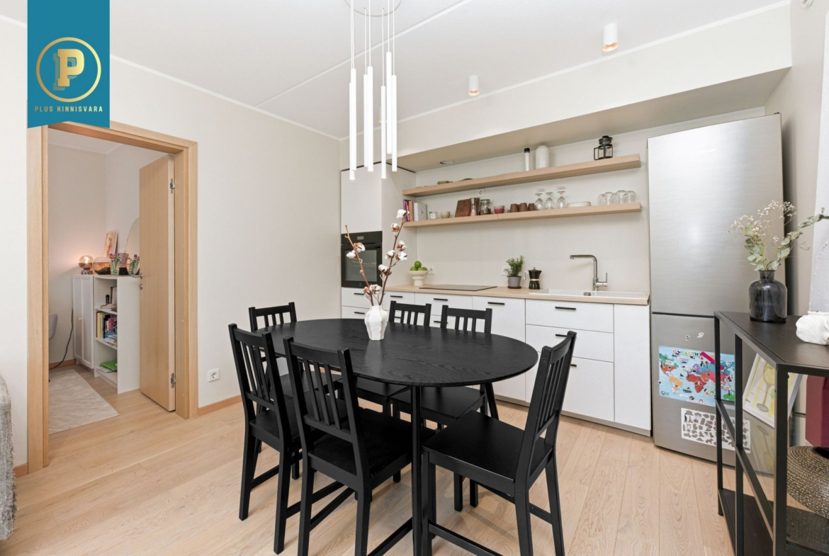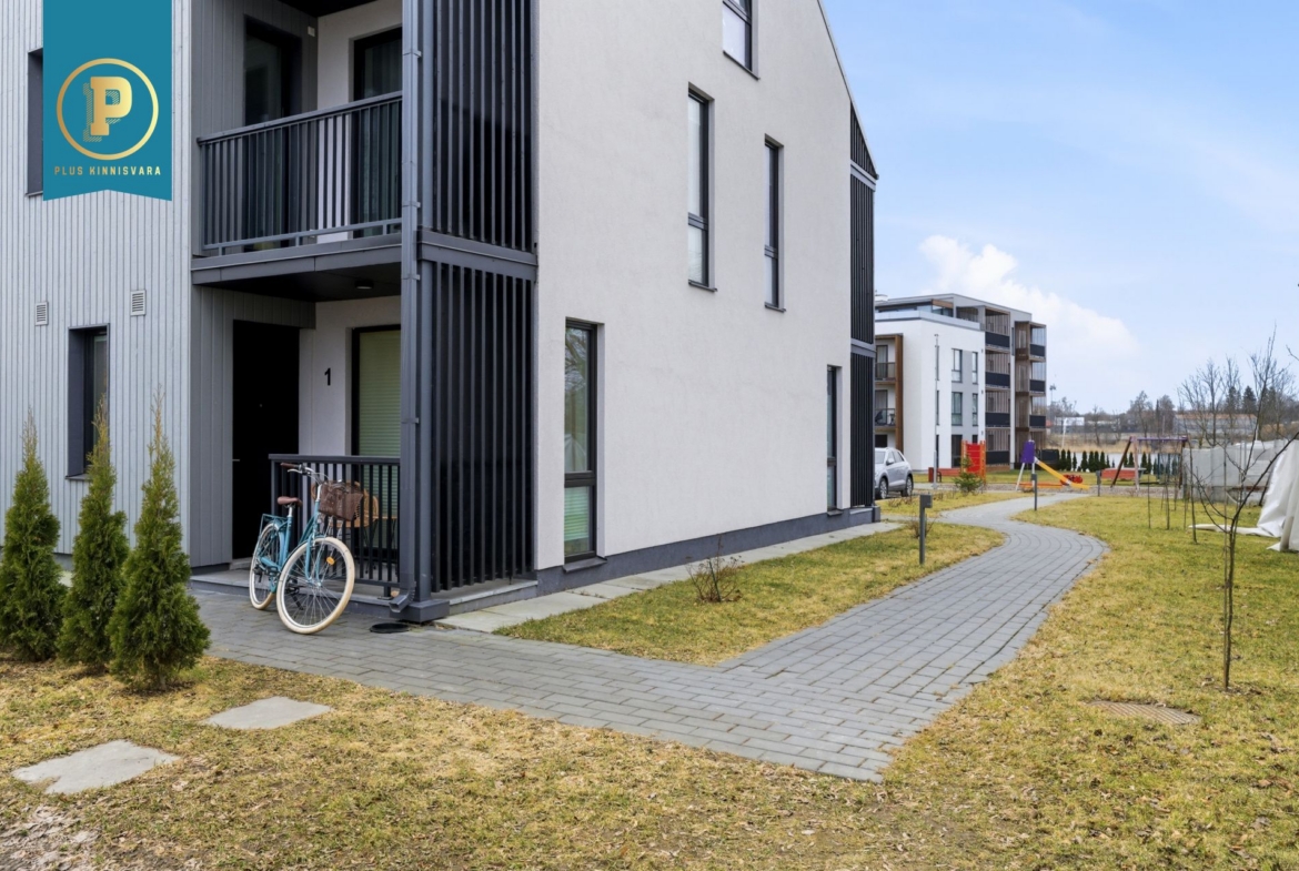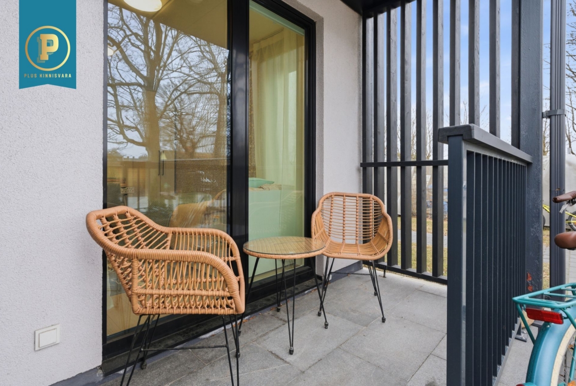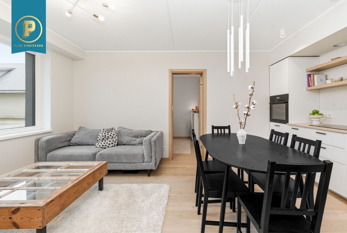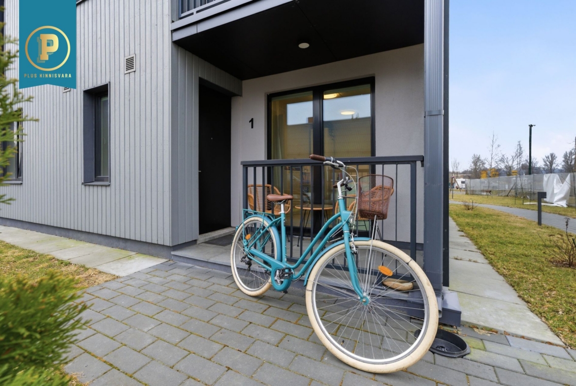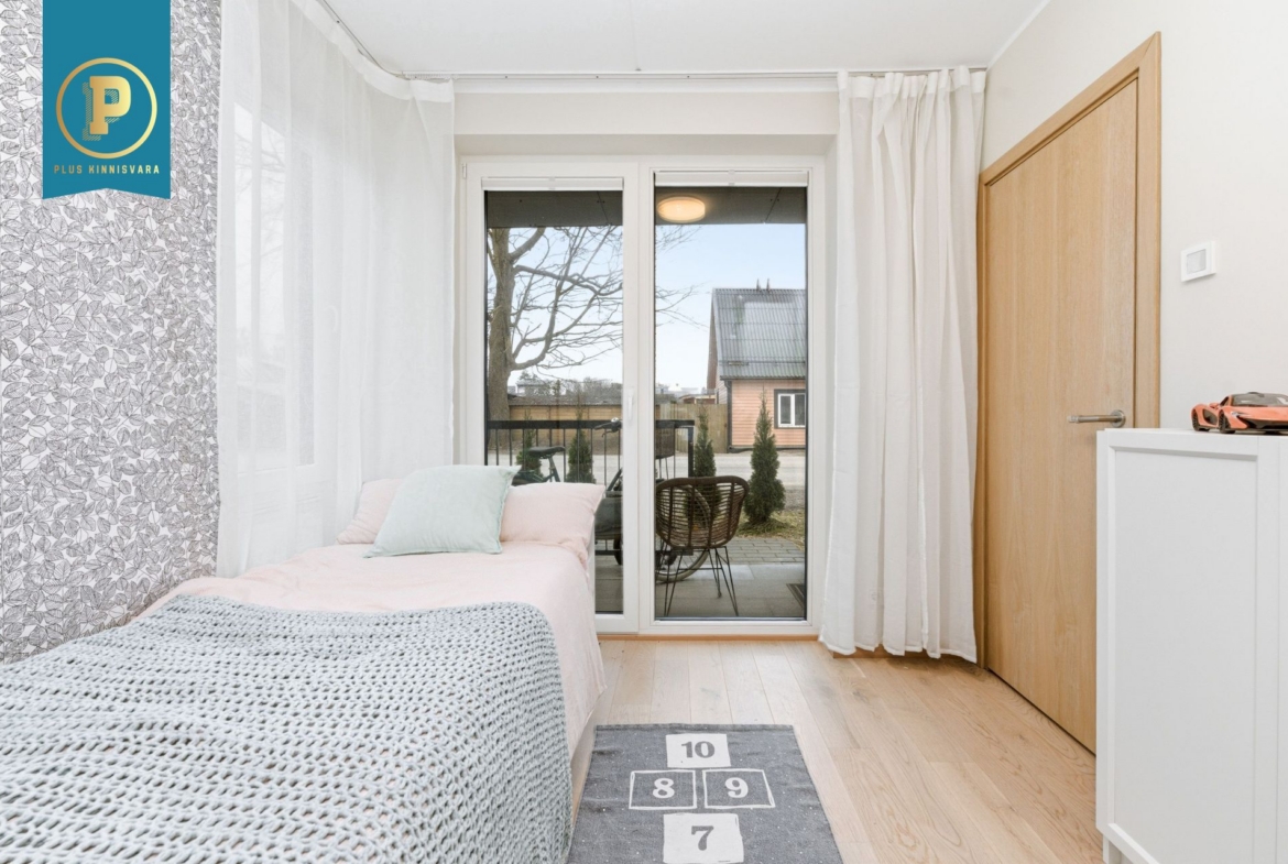 Pakutav kodu on väga läbimõeldud ja mugava planeeringuga ning selle koosseisu kuuluvad esik, avatud köögiga elutuba, eraldi pooltel asetsevad kaks magamistuba ja vannituba-tualett. Lisaks terrass, kuhu pääseb nii välisuksest, kui ka suuremast magamistoast. Eraldi sissepääs pakub mõnusat privaatsust. Siseviimistluses on kasutatud kvaliteetseid materjale, tubade põrandaid katab tammeparkett ning seinad on värvitud heledates toonides, ühe magamistoa sein on tapetseeritud. Esiku põrand ning vannitoa põrand ja seinad on plaaditud.