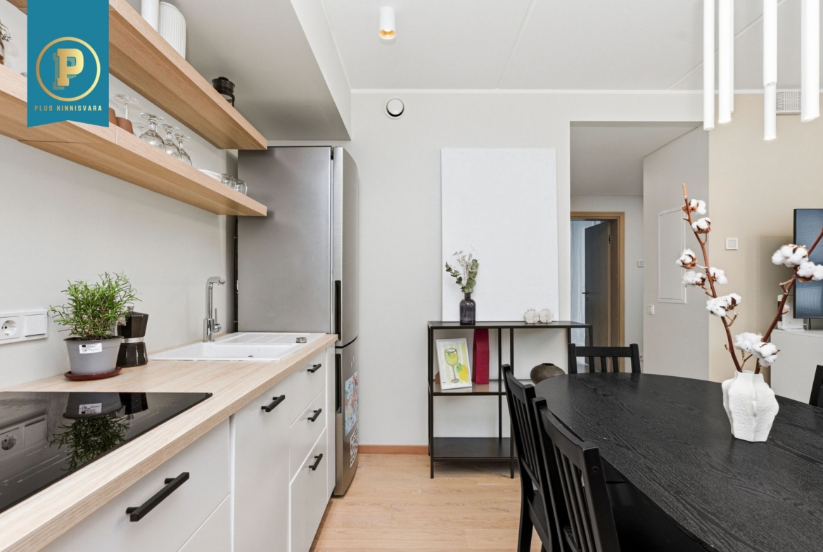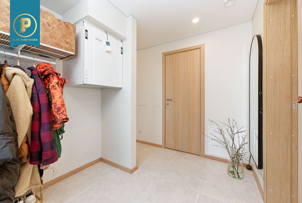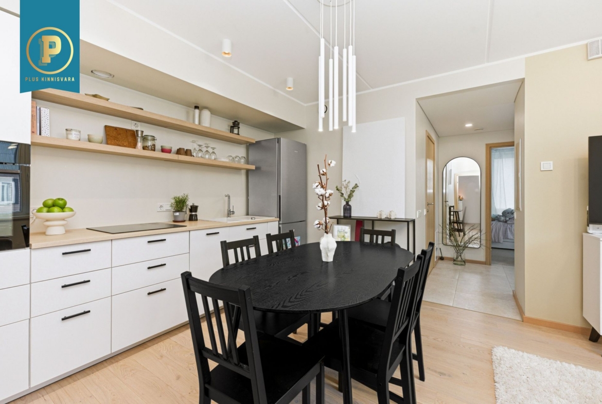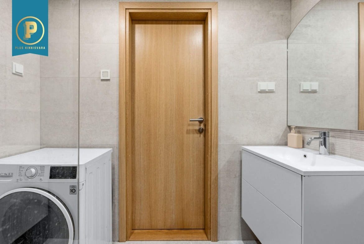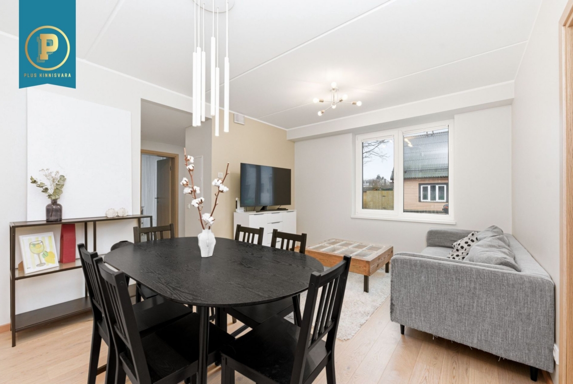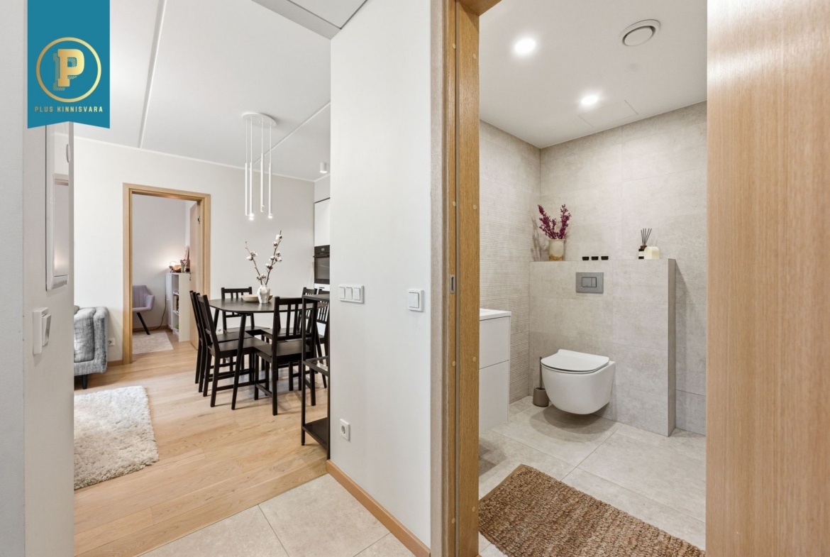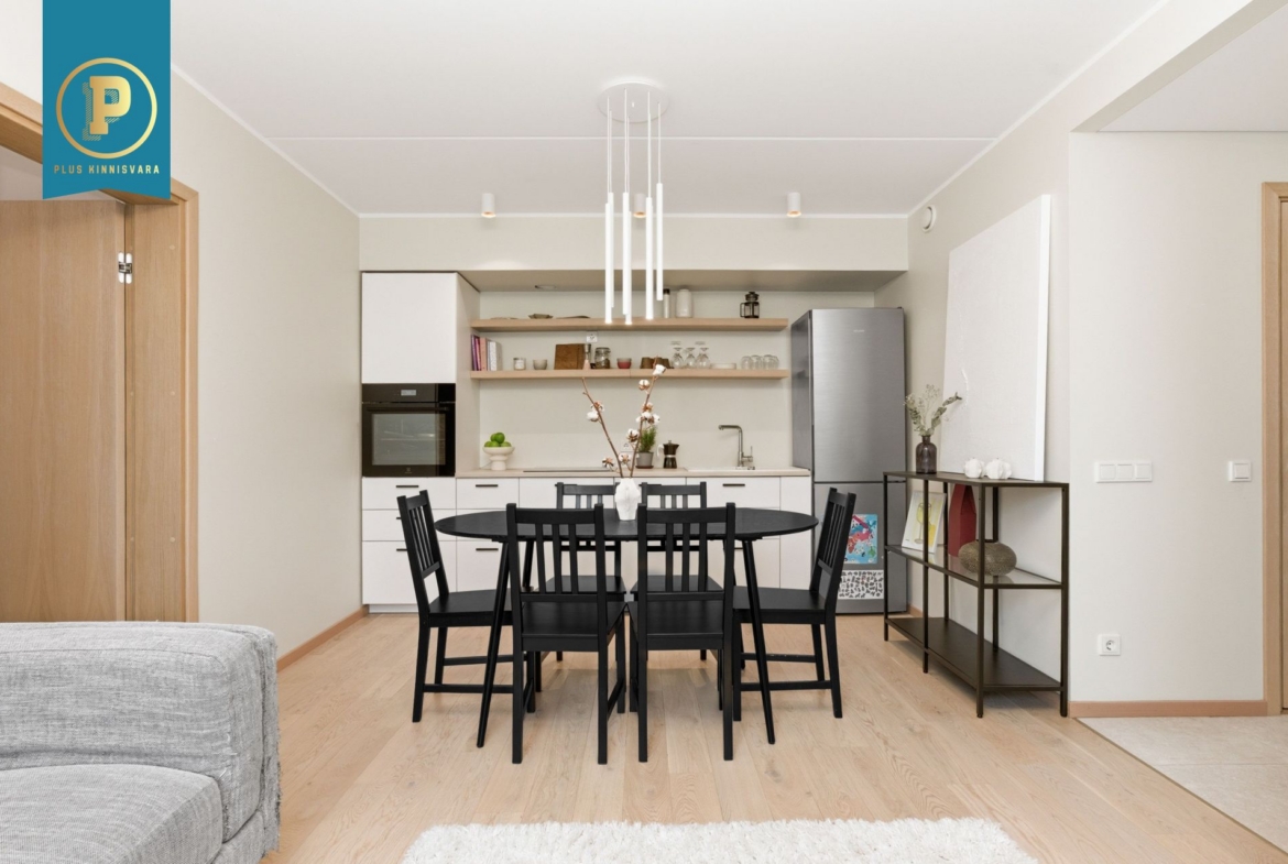 Pakutav kodu on väga läbimõeldud ja mugava planeeringuga ning selle koosseisu kuuluvad esik, avatud köögiga elutuba, eraldi pooltel asetsevad kaks magamistuba ja vannituba-tualett. Lisaks terrass, kuhu pääseb nii välisuksest, kui ka suuremast magamistoast. Eraldi sissepääs pakub mõnusat privaatsust. Siseviimistluses on kasutatud kvaliteetseid materjale, tubade põrandaid katab tammeparkett ning seinad on värvitud heledates toonides, ühe magamistoa sein on tapetseeritud. Esiku põrand ning vannitoa põrand ja seinad on plaaditud.
