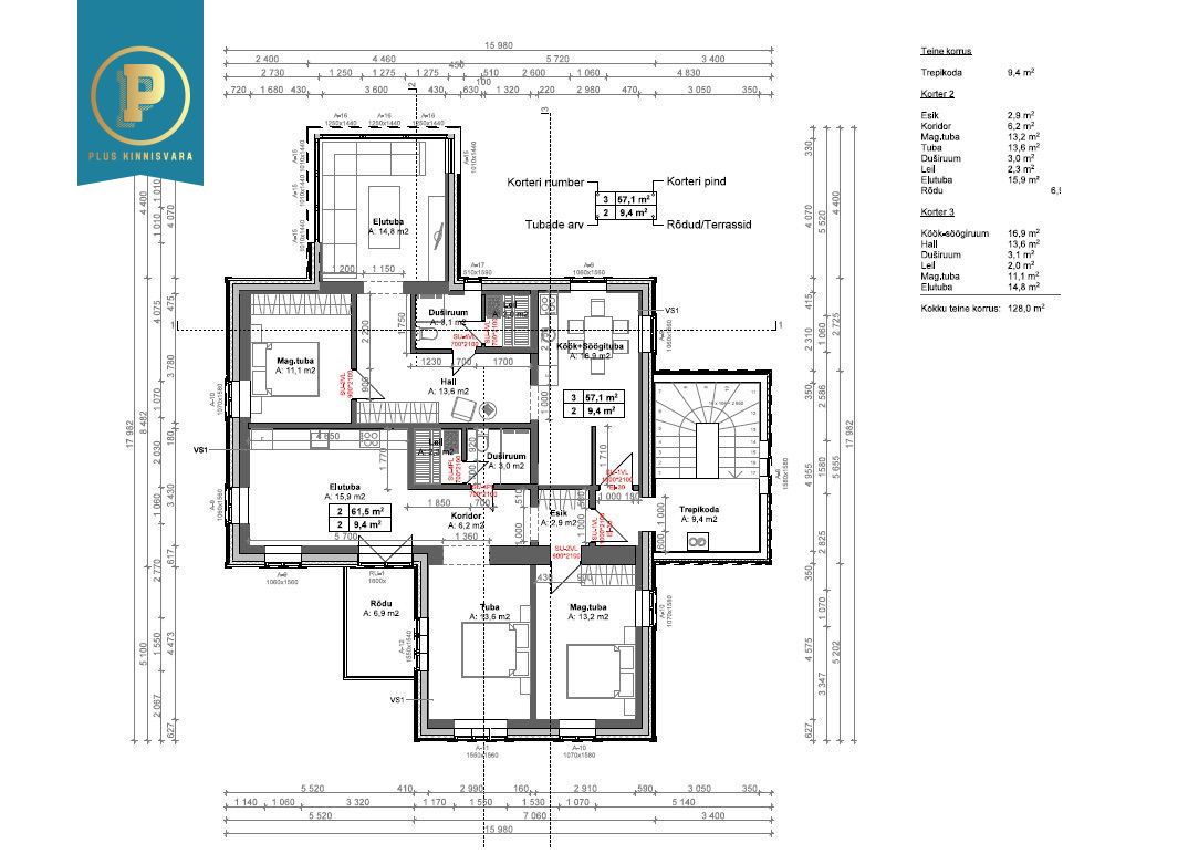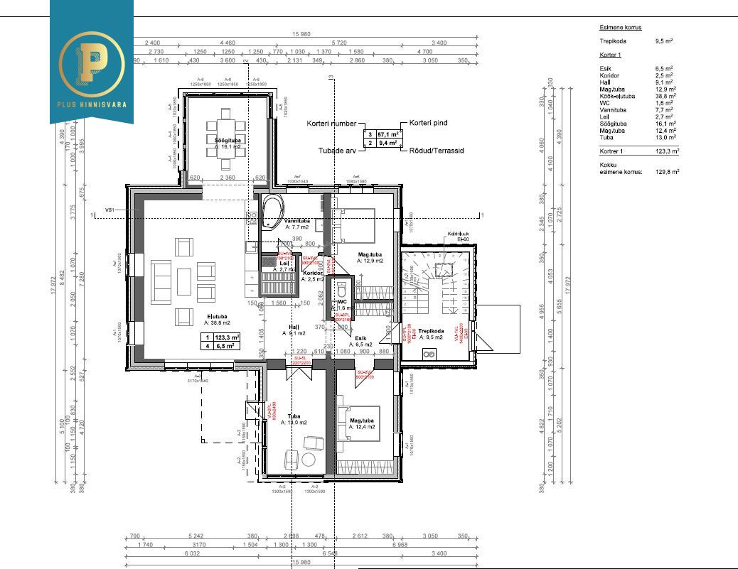 I korrusel korter suurusega 123,3m2 (praegu restoran ja selle abiruumid), aga on lihtsalt tagasi muudetav 3-toaliseks korteriks;